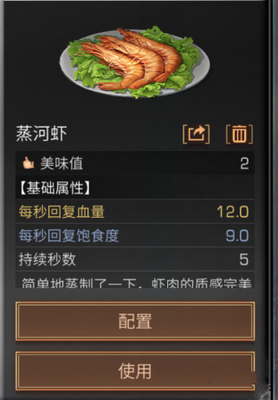 蒸河虾 食材:河虾 基础的河虾只有饱食度哦,高品质的会有回血效果。