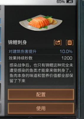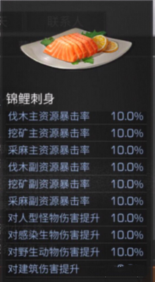 锦鲤刺身 食材:锦鲤 这个锦鲤的属性是超级多的,而且持续时间也是1200S的哦 ~