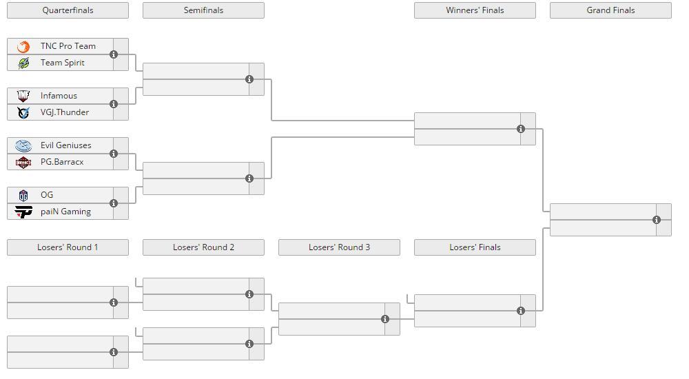 出线战队:Spirit、paiN、VGJ.T、PG(外卡出线) 注:OG战队中,7ckngMad和KheZu分别替补Notail和s4;W33作为替补代表paiN出战。