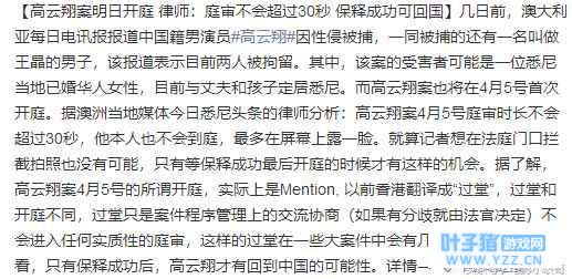 在今天早上,澳媒又再度爆出了猛料,就是高云翔的案件将于澳大利亚时间4月5号首次开庭。并且据媒体报道,这次开庭的时间不会超过30秒钟,而当事人 也不会到达现场,高云翔等人可能最多在屏幕上露个脸,相当于走个形式一样。但是不要小看了30秒钟,因为这三十秒钟能够直接说明了案件的性质,以及高云翔回家的时间!之前有律师透露高云翔最高面临二十年的牢狱时光,而且一年之内无法回国,而根据最新的情况显示,高云翔如果在明天的庭审上保释成功的话,明天就可以马上坐上回国的机票!这个消息对于高云翔来讲,是一个重大利好的消息!