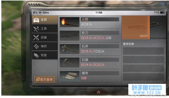 二、怎么制作绷带和生产工具? 斧头、搞头、火把及绷带等按配方开采都所需资源后就可以直接进行打造,下面小版以新手教程里的砍刀为例为大家做个简单展示: 首先按照配方所需用斧头开采60木头、40石头、2麻(仅供参考,具体打造所需材料请以游戏内为准)