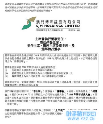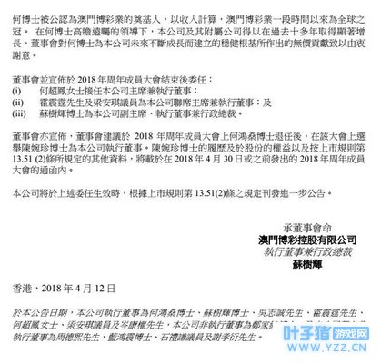 澳门博彩控股有限公司4月12日在港交所发布公告称,公司主席 何鸿燊将在6月12日年度股东大会上正式退休。 现年96岁的何鸿燊将成为澳博荣誉董事长。 女儿何超凤接任公司主席兼执行董事 。霍震霆及 梁安琪 议员将 接任公司联席主席兼执行董事 。苏树辉博士为本公司副主席,执行董事兼行政总裁。 董事会亦宣布,董事会建议于2018年周年成员大会上何鸿燊博士退任后,在该大会上选举 陈婉珍博士为公司执行董事 。