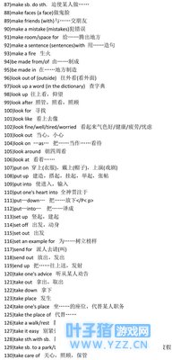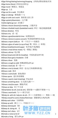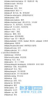 中考英语复习词组攻略之介词短语篇 二、动词短语、介词短语和其他词组 1)ask for 向……要……,请求 2)ask for leave 请假 3)send for 派人去请(叫) 4)pay for 付……的款 5)wait for 等候 6)thank for 为……感谢 7)apologize to sb. for sth. 为某事向某人道歉 8)look for 寻找 9)leave…for 离开……去…… 10)fall off 跌落 11)catch cold 着凉,伤风 12)catch up with 赶上 13)agree with sb. 赞成,同意某人的意见 14)filled……with 把……装满</P< p> 15)tell sb. about sth. 告诉某人某事 16)talk about 谈论…… 17)think about 考虑…… 18)worry about 担忧…… 19)look after 照料 20)run after 追赶,跟在后面跑 21)read after 跟……读 22)smile at 对……微笑 23)knock at 敲(门、窗) 24)shout at 对……大喊(嚷) 25)throw away 扔掉 26)work hard at 努力做…… 27)wait in line 排队等候 28)change…into… 变成 29)hurry into… 匆忙进入 30)run into… 跑进 31)hear of 听说 32)think of 认为,考虑 33)catch hold of 抓住 34)instead of 代替…… 35)hand in 交上来 36)stay in bed 卧病在床 37)hear from 收到……来信 38)at once 立刻 39)at last 最后 40)at first 起先,首先 41)at the age of… 在……岁时 </P< p> 42)at the end of… 在……之末 43)at the beginning of… 在……之初 44)at the foot of… 在……脚下</P< p> 45)at the same time 同时 46)at night/noon 在夜里/中午 47)with one's help 在某人的帮助下,由于某人的帮助 48)with the help of … 在……的帮助下 49)with a smile 面带笑容 50)with one's own eyes 亲眼看见 51)after a while 过了一会儿 52)from now on 从现在起 53)from then on 从那时起 54)far example 例如 55)far away from 远离 56)from morning till night 从早到晚 57)by and by 不久 58)by air mail 寄航空邮件 59)by ordinary mail 寄平信 60)by the way 顺便说 61)by the window 在窗边 62)by the end of… 到……底为止 63)little by little 逐渐地 64)in all 总共 65)in fact 事实上 66)in one's twenties 在某人二十几岁时 67)in a hurry 匆忙 68)in the middle of 在……中间 69)in no time (in a minute) 立刻,很快 70)in time (on time) 及时 71)in public 公众,公开地 72)in order to 为了…… 73)in front of 在……前面</P< p> 74)in the sun 在阳光下 75)in the end 最后,终于 76)in surprise 惊奇地 77)in turn 依次 78)of course 当然 79)a bit (of) 有一点儿 80)a lot of 许多 81)on one's way to 某人在去……的路上 82)on foot 步行,走路 83)a talk on space 一个关于太空的报告 84)on the other hand 另一方面 85)at/on the weekend 在周末 86)on the left (right) 在左(右)边 87)on the other side of 在……另一边 88)on the radio 通过收音机(无线电广播) 89)to one's joy 使……高兴的是 90)to one's surprise 使……惊讶的是 中考英语复习词组攻略之量词词组和其他词组 三、量词词组和其他词组 (一)量词词组 1)a bit 一点儿 2)a few (of) 一些(可数),几个…… 3)a little 一些(不可数) 4)a lot of (lots of) 许多 5)a piece of 一张(一片,块) 6)a cup of 一茶怀 7)a glass of 一玻璃杯 8)a pile of (piles and piles of) 一堆(一堆堆的)……</P< p> 9)a box of 一盒 10)a copy of 一份,一本 11)a bowl of 一碗 12)a basket of 一篮 13)a plate of 一盘 14)a bottle of 一瓶 15)a basin of 一脸盆 16)a set of 一套 17)a kind of 一种 18)a type of 一种类型的 19)a great deal of 非常多,大量的(不可数名词) 20)a large (great) number of 非常多,大量的(可数名词) 21)a great many 大量,许多(可数名词) 22)a different type of 一种不同型号的 23)a group of 一队,一组,一群 (二)其他词组 1)all kinds of 各种各样的 2)all over the world/the country 全世界/全国 3)all over 遍及每一部分,浑身 4)all one's life 一生 5)one after another 顺次 6)the Children's Palace 少年宫 7)day after day 日复一日 8)up and down 上上下下 9)the day after tomorrow 后天 10)the day before yesterday 前天</P< p> 11)the last/past two years (or so) 最近两年(左右) 12)the whole country/the whole world 全国/全世界 13)a moment ago 刚才 14)just now/then 刚才/那时 15)half an hour's walk 步行半小时的路程 16)late on 过后,后来 |