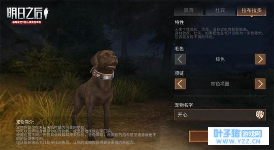 图3: 拉布拉多 宠物犬 解锁天赋,血性兼智慧的伙伴 《明日之后》的世界里,野外探索、采集是最重要的活动。在危机四伏的野外,玩家们需要随时注意四周环境、提防感染者袭击。此时狗伙伴的重要性就凸显出来了。经过训练员训练,宠物狗可以根据习性,成为家门犬、搜索犬、负重犬的任一种。