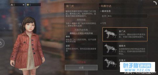 游戏内共有三条宠物犬:黑背、杜宾和拉布拉多。 1、黑背:擅长搜寻,可以搜寻更多的东西回来。 2、杜宾:擅长看家,看家的伤害提升。 3、拉布拉多:擅长负重,增加两格负重背包。