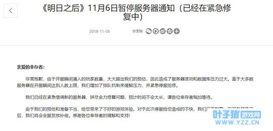 有多火爆呢?网易的服务器硬生生被挤爆了,中午11点,许多玩家正在游戏中,突然,服务器直接卡死。下图是《明日之后》官方给予的通知。
