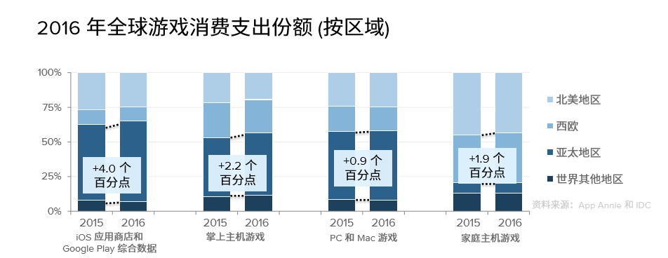 由于中国错失了家用机市场,导致亚太地区对于家用机市场的贡献相对较低 笔者认为:中国市场具有其 独特性 。十几年前的一纸公文以及盗版游戏的纵横,几乎断送了国产单机游戏和家用机的前程。在北美地区,家用主机作为最初的主要游戏功能载体,占据了游戏业界相当的分量,同时期的日本则更加如此。在智能手机未出现时,人们娱乐的载体主要集中为:家用主机、掌机、PC,这三者共同分割着游戏业界的市场份额。而同期的中国市场,由于对于家用主机的禁止,盗版游戏的泛滥等,PC端的网游、页游以及拥有着一定份额的掌机,共同构成了当时的中国游戏市场,其中PC端更是游戏市场的中流砥柱。2000年6月,《 关于开展电子游戏经营场所专项治理的意见 》发布,中国的主机市场进入了长时间的冰冻期。这份困扰着主机市场的公文终于在15年后——2015年得以修正,主机可以正式销售、生产。但逝去的毕竟是长达15年的时间,15年间,作为霸占游戏业界的PC游戏,尤其是网游的兴起培养了一大批的用户,当游戏主机怀揣着十几年的梦想进入中国市场时,留给其机会已经十分渺茫。 而在主机消失的这15年间,尤其是自2010年智能手机的出现、普及、带来了手游的兴起,在主机解禁之前抢占了游戏市场。从上可以看出,手游无论是从用户规模、使用率来说,其发展速度十分惊人。那么手游目前到底占取了多大的游戏市场份额呢?