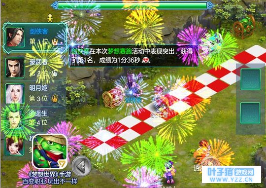 【图3 全服烟花】 梦想赛跑 趣味比拼 等级≥30级的少侠即可参与的单人玩法,活动时间为10月1、3、5、7日,每天11:30-12:00,19:30-20:00。参与活动后,5名家匹配到一组,进行赛跑比赛。赛跑途中不能改变前进或后退的方向,只能在岔路处选择向左走或向右走。玩家可以使用道具提高自己少侠移动能力或限制他人的移动能力。最先到达终点的玩家拥有宝箱优先选择权且有更高的几率获得高价值奖励。合理的运用道具更有利于获得胜利。