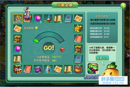 【图5 狩猎大会】 习武之路 好礼不停 除了精彩的国庆活动,新服同步开启“习武之路”活动也是必玩项目,通过日常玩法可以获得习武券,每消耗10张习武券可以获得一起行动机会,长按可以控制掷骰子的力量,力量会影响到点数的大小。获得的习武券到达一定数量后角色造型会发生变化。9月22日新服“盛世长歌”一定要记得去参与习武之路活动哦,各种好礼等你拿!