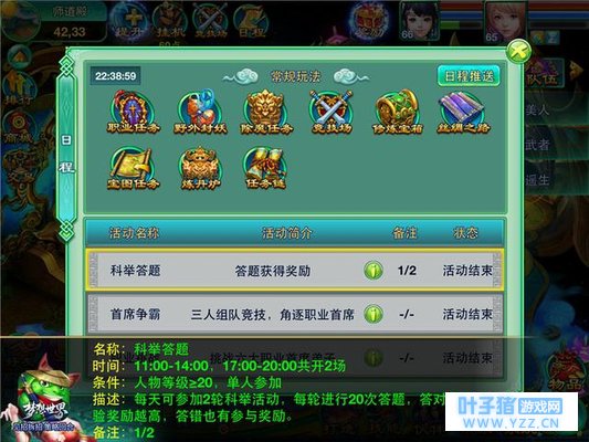 【图二:趣味问答】 冲级捷径,科举考试不容错过 当然对于那些急急忙忙的升级党来说,科举考试更大的意义是其提供的超丰厚经验奖励,据粗略估计,科举考试中答对一道题获得的经验在2000~3000作用,对于一个40级的玩家来说,升一级需要13万左右的经验——假设20道题全部答对,那么每天两次的科举考试刚好足够升一级。比起无尽的除魔封妖,和东跑西跑的职业任务,利用科举考试升级的效率之高,令人咋舌。所以大家千万不要以为科举考试只是一个可有可无的小活动,在《梦想世界》手游中,它的价值绝对是不容小觑的。