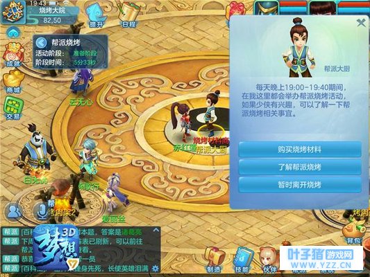 帮派烧烤 快乐交友 《梦想世界3D》中的帮派烧烤也是一个趣味十足的活动,每天晚上7点都能喊上帮派好友一起到烧烤大院中烤肉,在帮派大厨买好食材之后就可以放烤肉架开始调味啦,烤肉时可以选择给自己的烤肉或者是帮派其他人的烤肉调味,每次活动中每个人可以做4次烤肉,也可以吃4次,分别自己做的2次,别人做的2次。大家做完的烤肉记得和好友分享哦,丰富的经验和银币等你拿!