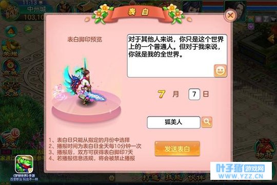 大声说爱 普天同庆 传情玉符表达爱意的方式可不是悄悄替你转达,爱就要大声说出来!在表白日当天,你所选择的表白内容将会每隔十分钟由系统播报一次,并且每次播报时所有在线玩家获得一个小时的“普天同庆”效果,表白者和被表白者都会获得持续7天的“爱心脚印”。不敢在综合频道公开说爱的你,就交给传情玉符吧!系统替你大胆说爱,帮你放普天为你打造浪漫表白日。