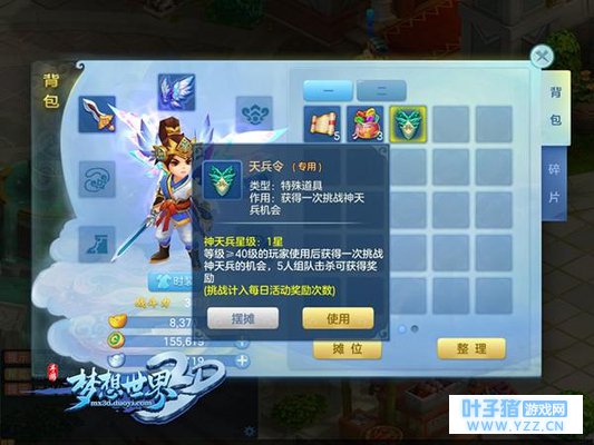 勇者证明 天兵之令 现在各位侠客们已经可以在《梦想世界3D》的珍品商城中以低廉的价格购买到“天兵令”道具啦!使用“天兵令”道具可以让等级达到40级的玩家获得一次挑战神天兵的机会,5人组队击杀神天兵可以获得十分不错的奖励哦!并且使用天兵令挑战的神天兵也是会记录进每日的活动奖励次数里的哦!