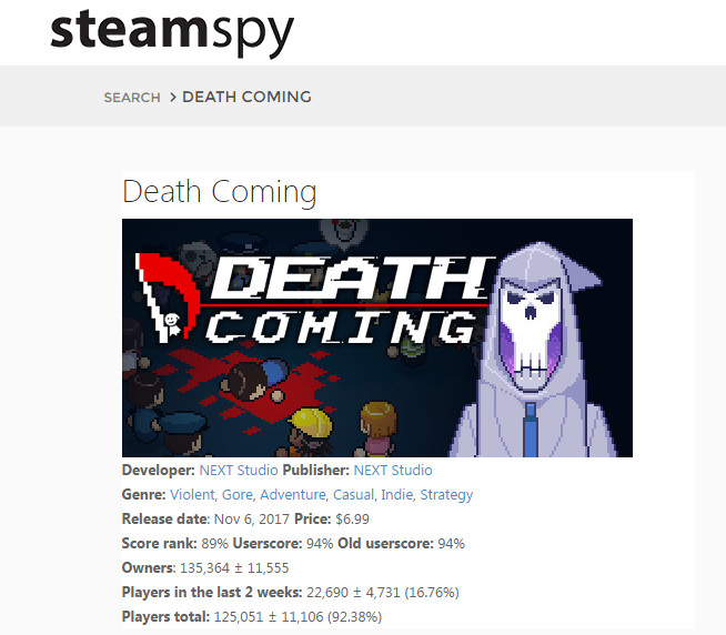 Steamspy上实时数据 根据Steamspy上实时数据,《死神来了(Death Coming)》已售出13万+的数量,按照每份6.99美元的售价,其总销售额已超过了94万美元,折合人民币600万元!有谁能够想象到,这样一款戏谑搞怪的点击互动游戏居然出自腾讯之手? IPA冠军 最佳游戏设计与创新提名 与其说是出自腾讯之手,倒不如说是出自腾讯IEG互动娱乐旗下的工作室——NEXT Studio。这两者间还是有些区别可言的。NEXT Studio作为去年3月成立的小团队,其核心目的和大家所熟知的天美工作室、北极光工作室、量子工作室等大工作室不同,NEXT Studio是基于新的体验和技术,研发制作出富有新鲜感、较为乐趣的高品质游戏,而不是纯粹为了赚钱而生。