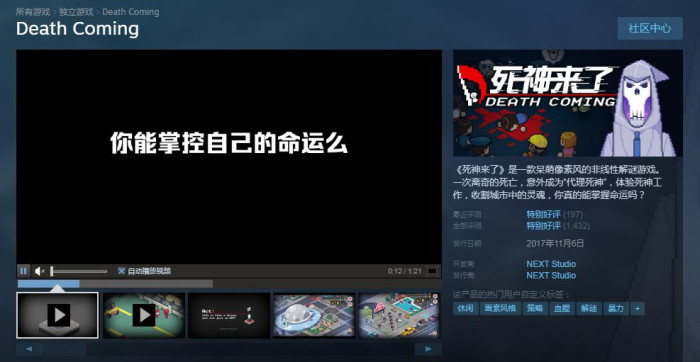 人生就像玩游戏,你只是一个NPC。 去年年底,一款名为《死神来了(Death Coming)》的像素风策略解谜游戏上架了Steam平台。截至2018年1月,这款售价28元人民币的游戏好评率高达94%,取得了特别好评的成绩,并一度登上Steam首页推荐和新品热销榜单。