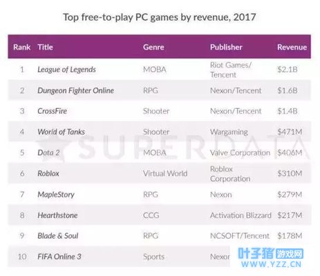 可这一天注定不会来得太快,在去年腾讯的这三位廉颇不但仍未老矣,还把端游收入的米缸端起来一口闷,吃掉了一小半。 美国数据网站SuperData在1月末发布了 《2017年游戏市场收入规模》 , 在免费PC游戏吸金榜上,排名前三的依旧是LOL、DNF和CF。
