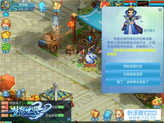 宝图任务 奖励丰富 明月城的游方道士长年云游四海,经历世事沧桑,关于贼王的各种江湖消息灵通。据说只要找到藏匿在各地的贼王并战胜他们,就有可能获得藏宝图,找到珍贵宝藏。等级到达25的侠士可以接取宝图任务来获得珍惜的藏宝图,而通过挖宝每天能获得不错的银币收入,还有机会获得珍惜的道具以及更加珍贵的超级藏宝图碎片!