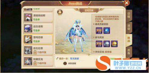 在主界面的挑战面板中,即可看到BOSS挑战的内容。其中会显示适合自身等级的BOSS,还可以看到奖励说明和BOSS刷新时间,让玩家不会错过挑战的机会。