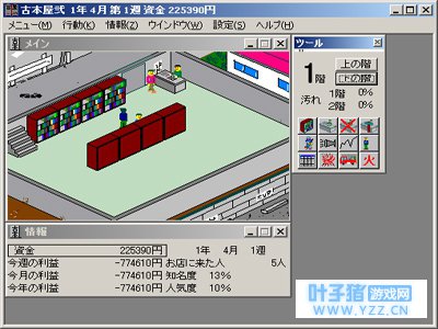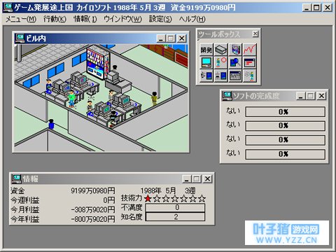 游戏《The 旧书店2》截图 虽然这两部游戏的画面都比较粗糙,但其新颖的玩法也奠定了日后开罗游戏的发展方向——模拟游戏。 同年,开罗游戏工作室发布了《游戏发展途上国》,在游戏中玩家将运营一家游戏工作室,真正地实现了在游戏里开发游戏。这一部游戏依然是作为《Tech Win》的随刊赠品发布的。有趣的是,开罗的官网在这部游戏的介绍之后用括号标注了一句话,大概意思是这样的:游戏最终没能实现商品化,着实令人遗憾。