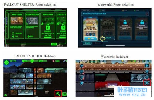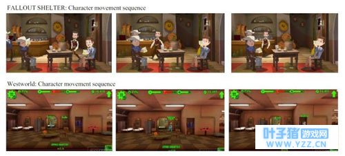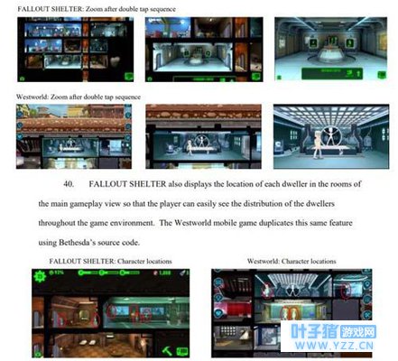 Bethesda在起诉书中称,2014年Behaviour曾协助开发《辐射:避难所》,而现在他们违反了当时的合同,窃取在《辐射:避难所》中使用的素材,并将其用在《西部世界》手游当中。 不仅是游戏的玩法,两款游戏在布局、场景、房间特写镜头、角色位置、操作方式、UI等方面都有极高的相似性。
