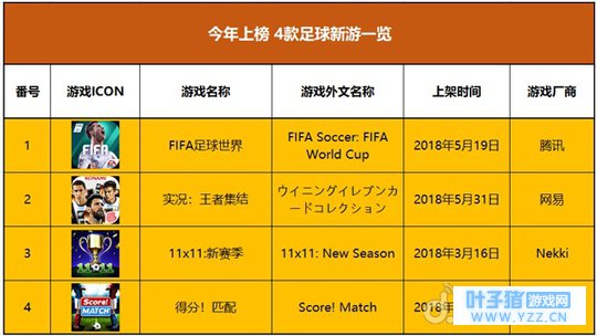 足球新游情况:《Score! Match》进入4国榜单 八国AppStore前200榜单,共有4款产品为今年推出的新手游。其中,在中国初上架的《FIFA足球世界》与《实况:王者集结》,实则在国外早已发行。俄罗斯厂商Nekki的《11x11: New Season》也只是俄罗斯走火。仅有英国First Touch的《Score!Match》(得分!匹配)进入德国、巴西、英国、比利时4国榜单。