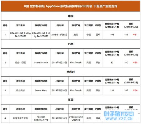 世界杯期间排位下降最快的手游:《FIFA ONLINE 3 M by EA SPORTS》、《Score! Match》 虽然,世界杯期间这些手游俨然已成为爆款,但是相较于世界杯开赛之前,一些产品其实已呈下滑趋势,比如中国国内发行的:《FIFA ONLINE 3 M by EA SPORTS》,世界杯开赛前该款手游位居游戏畅销排名TOP.108,开赛之后则下滑了81个名次,如今位居TOP.189。又比如:在巴西发行的《Score!Hero》,开赛前一个月还在TOP.82的位置,开赛之后则下滑至TOP.187。