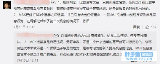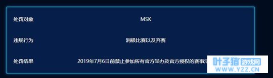 简单说就是这位选手参加一个争取训练营资格的比赛,在淘汰掉了几位选手后,没有任何理由就退赛了。 有意思的是,MSK所在的TSV战队有直播合同,而训练营是规定不让直播的,TSV的领队已经说过不参加这个比赛的海选。 所以MSK的参赛本身很有问题。 事后被官方以消极比赛处罚禁赛。