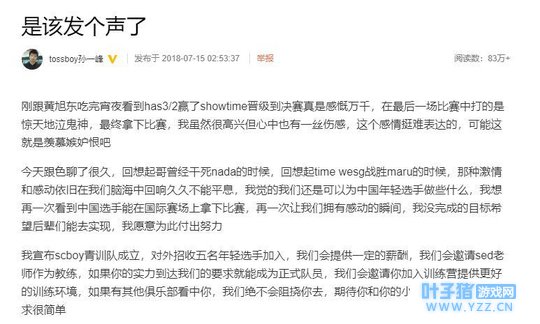 赛后没过多久,著名星际选手、解说F91就表示,看到如此精彩的比赛,想为中国星际做点什么,于是宣布即将成立scboy青训队。