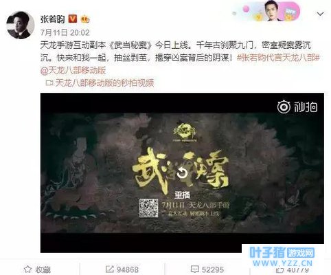 最后时刻,是此次副本玩法的高潮环节。凶手对玩家动手,玩家需要在凶手拳头达到的瞬间点“接招”按钮,此后,武当掌门便会击退凶手。 此次副本,在玩法上紧密贴合武侠题材本身的特质,并且环环相扣的剧情和惊险刺激的动作场景让玩家大呼过瘾的同时,也让玩家感受到武侠MMORPG游戏不一般的体验。值得一提的是,副本场景出现的“揽雀尾”、“梯云纵”等武当秘笈将以真实还原的形式出现在游戏武当派之中,使玩家对武当招式的威力有了更深层次的认知。 以明星为切入点,让更多人看到一个全新的MMORPG 在副本内的实景环节,可以看到,武当掌门是由张若昀扮演,而张若昀在此之前便已出演过《法医秦明》、《九州·天空城》等电视剧,在国内年轻一代的用户对其拥有极高的辨识度。做为新一代流量明星,张若昀微博粉丝数量已突破1600万的量级,而其转发的《天龙八部手游》互动副本《武当秘案》,在短短几日转发量已然逼近10万大关,微博留言同样有五万的粉丝对其表示支持,可见张若昀在市场的影响力。