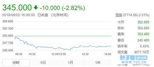 1. 腾讯市值继续下跌,市值蒸发逾 12300 亿港元。 8 月 2 日,腾讯连续第六日收跌,盘中最低跌至 340.4 港元,创 10 个月新低,最终收报 345 港元,跌 2.82%,成交额放大至 140.93 亿港元,最新总市值 32852 亿港元。腾讯股价离今年 1 月底最高价 475.6 港元已跌去了 27.5%,市值蒸发逾 12300 亿港元。