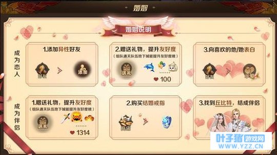 伴侣阶段:赠送礼物提升好感度(达到1314)、购买钻戒、找到丘比特结成伴侣 大家可以看到,结交、告白、买钻戒和结婚,这四步都是可以一次性完成的,而唯有提升好感度是一个长期的过程,就好比现实生活之中的恋爱,只有两人的感情相处提升到某一程度,才有可能会有婚姻的诞生。结婚的时候别忘了办一场盛大的婚礼,可邀请朋友们来参加简直风光无限。