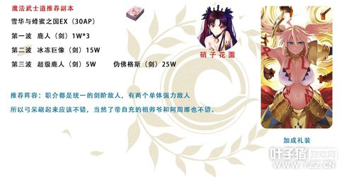 地点推荐: 魔法武士道武藏建议在雪华与蜂蜜之国EX(30AP)副本速刷。 阵容推荐 这个副本的敌方配置是统一的剑阶敌人,所以可以考虑用弓阶来克制,泳装活动抽到弓呆的玩家可以马上用起来,祖师爷和阿周那也是不错的选择。 掉落加成: