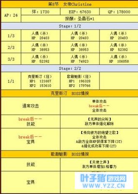 FGO国服此次开启的1.5章新宿篇相信已经让很多的玩家跃跃欲试,并且成功翻车了,FGO新宿此次难度虽然没有高到过分,但是对于平时咸鱼的玩家来说难度还是比较高的,下面一起来看看吧。 第8节 克里斯汀break后请尽快击倒,以免被全体攻击团灭
