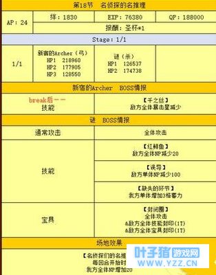 第12节 罗密欧与朱丽叶必须在放出宝具之前击倒,不然血量会回满 新宿的Assassin开战时会清空我方NP,所以别想着攒NP秒掉他了 不过也可以准备一个打手放后排 。每回合开始时他会上某一色卡耐性,不要头硬用有耐性的卡去打他