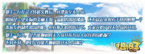 御主一行在灵子转移失败后,竟漂流至无人岛。眼前是一望无际的美丽大海。温和的海风拂面,还有砍起来很有手感的螃蟹…?本应专心制作离岛的船,但在斯卡哈的指导下,大家开始了对无人岛的开拓。御主一行人,是否能顺利将无人岛开拓为宜人居住的岛屿呢?不对不对,他们究竟能否顺利离开无人岛呢?