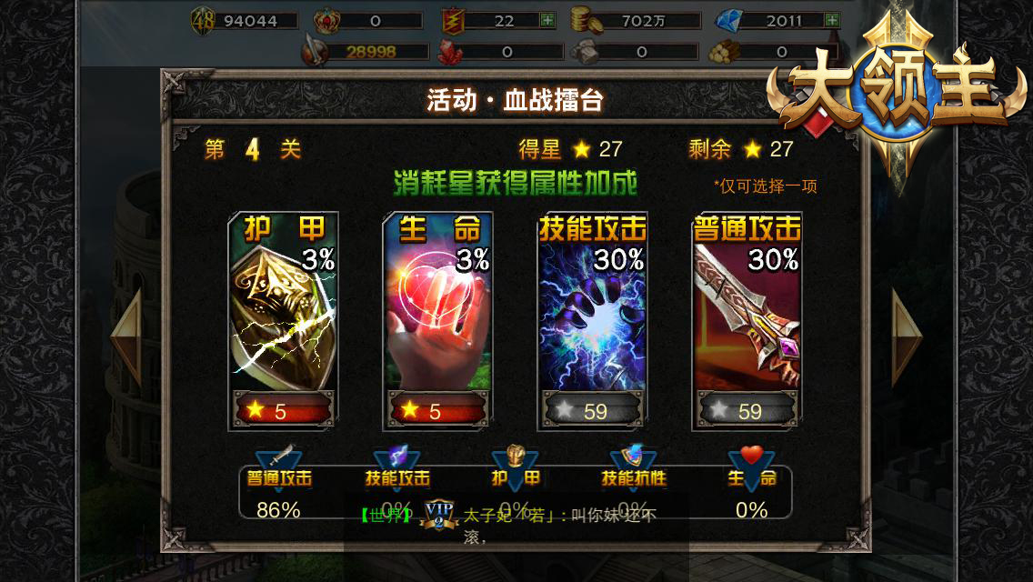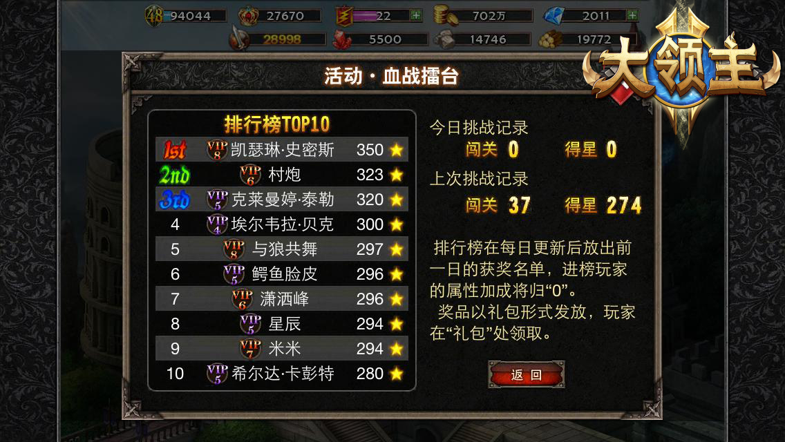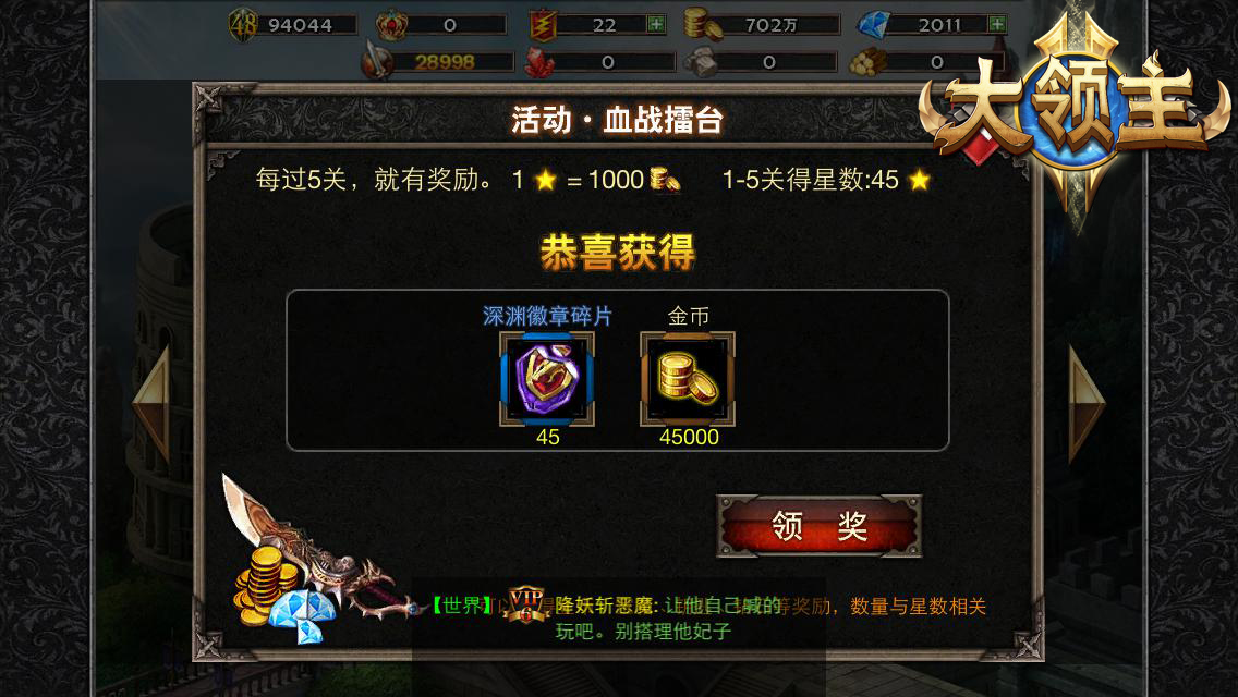 3、战斗选择: 每关具有三个战斗对象组的选择,分别有一个星数加成属性!每通过一定层数,都会有一次机会选择不同属性进行加强! 4、奖励设定: 每闯关5关结算一次奖励,奖品为金币和深渊徽章。闯关奖励也将随着关卡的递进而越发丰厚。 5、排名设定: 记录每个玩家一天的挑战纪录,在12点更新时,选出其中排名前10名的玩家,列出排行榜。系统会以当日获得星数作为评判标准。排名前10的玩家可以获得丰厚奖励! ·关注大领主官方微博、微信,请扫描上方图中二维码 ·在百度贴吧搜索“大领主”,查看更多有趣的攻略资讯 ·游戏中遇到任何问题,欢迎联系dlzh@kongzhong.com [编辑:夜雨]