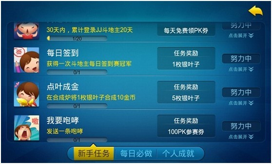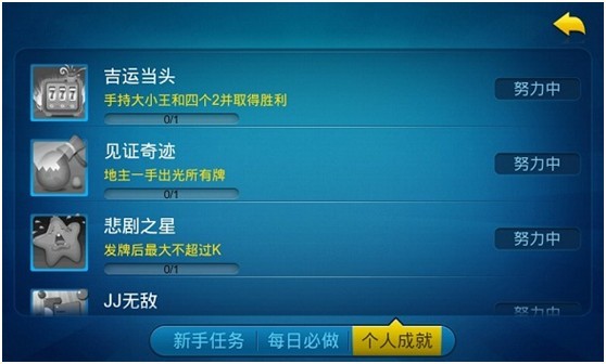 【游戏操作性】: 《JJ斗地主》的所有操作都是通过滑屏和点击来完成的。牌局中,除了常规斗地主游戏中的出牌和不出以外,《JJ斗地主》还特别设计了智能的提示功能,当不知道怎么出牌的时候,直接点击提示按钮,系统就会根据手中的牌给出最佳出牌选择。功能虽小,但也可算是一次小小的智能革命,在这里小编不免要为《JJ斗地主》的操作便捷和贴心加上分数。 评分:★★★★☆ 【游戏音效】: 小编经常被《JJ斗地主》诙谐的人物配音逗得乐不可支,每次炸弹一出来的时候,“火箭升空啦”的人声效果再配上气势磅礴的炸弹火箭画面,小编都会觉得自己其实是在看石班瑜为星爷配音的最新喜剧电影。同时,《JJ斗地主》还搭配了两套背景音乐,打牌的时候也能享受视听盛宴。小编必须要给音效点赞! 评分:★★★★★ 【游戏上手度】: 除了国粹麻将,斗地主大概是国民普及度最高的棋牌游戏了,非常大众化。JJ斗地主采用经典斗地主玩法,上手极为简单,相信谁都不好意思说自己不会玩。 评分:★★★★★ 【系统特色】: 《JJ斗地主》有两个细节小编不得不提,一个是任务系统,一个是咆哮互动功能。 感觉就像玩RPG游戏,玩家有新手任务、每日必做和个人成就展示。完成新手任务和每日必做领取奖品可以参加更高级别的赛事,而个人成就展示就能满足收集控对于各种称号的欲望,更能展现自己在《JJ斗地主》的光辉历程,反正小编每天看到自己的个人成就又有了新的称号总是感到别样满足。为了给自己增添辉煌战绩,小编每天都在奋斗! 《JJ斗地主》的咆哮功能实在贴心,小编可以在这里炫耀战绩鄙视群雄,召唤小伙伴抒发感情,还可以回复顶踩,谁说手机玩斗地主不能互动交流的,拉出去凌迟一百遍啊一百遍。小编在这里得到的关注比微博都多,太感人了。有了《JJ斗地主》,女盆友再也不用担心我沉迷游戏了,因为她都和我一起大声咆哮。 【总结】 玩过不少斗地主,像《JJ斗地主》这么高端洋气又欢乐的手游着实不多见,既能体会棋牌竞技的刺激,还能享受视觉和听觉上的快乐,更重要的是,还能和朋友一起互动,其乐无穷,小编必须摸着良心说,《JJ斗地主》是难得一见的精品! 扫描二维码,立刻体验: [编辑:夜雨]