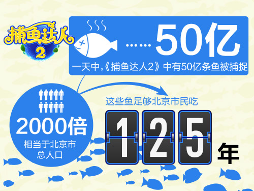 休闲手游《捕鱼达人2》日前发布了社交版,在轻松的单机游戏基础上加入了微博好友互动系统,以及包含运气因素的趣味新玩法“海洋之轮”,让习惯了传统捕鱼游戏的玩家眼前一亮,上线后立即获得玩家和媒体广泛关注。同时,《捕鱼达人2》还公布了一组趣味数据,下面就让我们通过数字来了解一下你所不知道的《捕鱼达人2》。 玩家每天在《捕鱼达人2》中爽快的捕鱼,应该没有想到自己到底会捕到多少条鱼吧。据统计,《捕鱼达人2》在一天中会有50亿条鱼被捕,这些鱼相当于北京市人口的2000倍,够北京市民吃125年。 手机游戏最基本的操作就是触屏,《捕鱼达人2》一天中玩家点击触屏竟然高达100亿次,总点击面积相当于10个足球场地的总和。 玩《捕鱼达人2》最爽快的莫过于金币哗啦啦进账的时候,如果一个金币和一个一元硬币大小一致,那么《捕鱼达人2》玩家一天金币的总和可以达到500亿,连起来将绕地球赤道一周。 《捕鱼达人2》中一天发射的炮弹数量是100亿次,相当于二战时期英国军队生产的子弹数量。如果那个时候就有《捕鱼达人2》,让那些喜欢向邻国射炮弹的战争狂人都去玩捕鱼,是不是世界和平的问题就轻易解决了? 图5 鲨鱼出没注意,《捕鱼达人2》中的小鱼可不是呆头呆脑任人捕捉的,这些加入智能程序的鱼懂得灵巧躲避炮弹,尤其是大鲨鱼,不仅不容易被捕捉,还会撞击炮台反抗玩家。《捕鱼达人2》中每天会有8亿条鲨鱼出没,这个数量相当于全球海洋里所有鲨鱼数量的总和,这么多鲨鱼都在你的手机中,你怕了没有? 《捕鱼达人2》每日有1000次的游戏开启,如果用来开启啤酒瓶盖,可以开启青岛啤酒厂一个季度生产的啤酒。目前,捕鱼达人系列游戏在全球已有3.2亿玩家,这些玩家手拉手可绕地球11圈。 《捕鱼达人2》AppStore下载:http://t.appcpa.net/tUJ1Yp 《捕鱼达人2》安卓极速下载:http://t.appcpa.net/R9YdQd 《捕鱼达人2》官网:http://2.fishingjoy.com [编辑:必杀技]