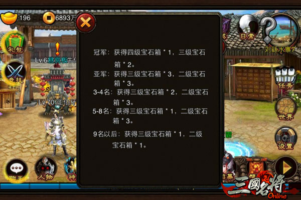 然后,《三国名将》每周开启一次的帮派大乱斗活动,将会让玩家幸福之感飙升极致。每周五晚上19:54活动正式开启,届时,玩家将会随意匹配到其他帮派的玩家,然后开始战斗。每次击败敌人,都能为帮派增加积分。如果实力超强的你,终结敌人连斩时,会为帮派带来更多的荣誉哦。最让玩家欢喜的是,只要参与大乱斗的玩家,都能拿到宝石宝箱等宝物。 周末狂欢 大乱斗额外奖励 既然是号称周末狂欢升级,《三国名将》自然还为玩家特别准备了周末礼物。凡在家族大乱斗中取得帮派总积分第一名的帮派,除了获得4级宝石宝箱之外,还能获得大乱斗礼包一份,里面含有用于魂符升级的中型魂符经验宝箱、购买宝石的玉币、打BOSS必备的血性战鼓,当然,也少不了海量铜钱。 关于《三国名将》 风靡全国,超过100万下载,上万5星好评的《三国名将》,是天拓游戏精心打造的三国题材RPG+策略类精品手游大作。横版回合玩法,画面超炫打击感强。在游戏里,你需要单挑吕布、征服世界boss从而解救貂蝉,战胜曹操释放大小乔,无双绝技击杀对手后,不仅有后宫选妃共度春宵,还有美少女武将狂欢大派对夜夜笙歌。而打造一身极品装备,培养一群霸气武将,可以让你三国猎艳更加无敌哟。 目前,人气手游《三国名将》震撼上架IOS市场,全新版本“天降神兵”火爆开启!斗智斗勇斗运气,抢钱抢粮抢妹纸,送元宝送礼包送绝版武将!还在等什么,赶紧行动吧! 《三国名将》官网:http://hssg.huolug.com/ 《三国名将》下载:http://hssg.huolug.com/html/downloads/ 《三国名将》新浪微博:http://e.weibo.com/teamtop2013 《三国名将》客服QQ:800042301 《三国名将》微信:sgmj-tx [编辑:杯中水]