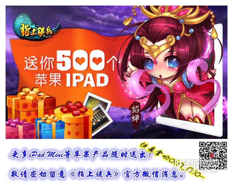 全球首款即时对战三国手游《指上谈兵》9大安卓平台不限量封测开启了!立刻关注《指上谈兵》微信公众号,iPad mini免费送! 《指上谈兵》首部高清实录宣传片:http://v.youku.com/v_show/id_XNjM2NjYxMjQw.html 中国手游豆玩游戏1500万独家代理全平台发行的《指上谈兵》12月2日暴力登录App Store,开启新服【一统天下】,在几乎无宣传情况下排名收费榜33名、游戏榜16名。同时官方携手360手机助手、小米游戏中心、UC九游、百度多酷、豌豆荚、91助手、当乐、中国手游中心、OPPO游戏中心9大安卓平台,同步开启不限量封测,进入即送价值9999元礼包。 为庆贺《指上谈兵》测试开启,官方特别推出“关注微信 送iPad mini”活动。即日起,玩家只需扫描“指上谈兵”微信二维码,或搜索微信公共账号“指上谈兵”关注《指上谈兵》官方微信,即有机会获得苹果iPad mini。 《指上谈兵》微信二维码: 《指上谈兵》: 【活动时间】12月2日—12月30日 【活动详情】 1、12月2日至12月30日期间,扫描“指上谈兵”微信二维码或搜索微信公共账号“指上谈兵”关注《指上谈兵》官方微信。 2、回复微信提交“所在服务器、角色名、对游戏的建议”,即自动获得抽奖资格。 3、12月3日、10日、17日、24日、31日将从当期活动参与玩家中随机抽取一名赠送iPad mini,整个活动共送出5台。 4、官方将在获奖名单公布后,通过微信联系获奖玩家,请参与活动的玩家及时关注微信信息,以便及时领取属于你的iPad mini! 《指上谈兵》官方还将推出更多活动回馈玩家,更多iPad mini等你来拿! 《指上谈兵》最爽卡牌指爆三国!中国手游豆玩游戏1500万国内独家代理,全平台发行全球首款3D即时战斗三国手游!2013年最不可错过的神作,融合策略、RTS、RPG多种玩法,突破传统卡牌游戏弊端,一圈一划指爆三国、一点一划秒杀全屏! 豆玩游戏是CMGE中国手游旗下位于广州的移动游戏发行团队,拥有专业的深度游戏运营能力、富有创新的产品营销能力、丰富的渠道整合能力。团队成员有激情、有创新、有责任心、务实肯干,凭借超强执行力、7*24的专业运维和客户服务水平,至力于为用户提供最好玩的游戏、最专业的服务。 《指上谈兵》官方网站:http://zs.cmge.com 《指上谈兵》官方玩家群:174661983 《指上谈兵》新浪微博:http://weibo.com/cmgezs 《指上谈兵》腾讯微博:http://t.qq.com/cmge_zhishangtanbing 《指上谈兵》微信公众号:指上谈兵(cmge_zstb) [编辑:Vince]