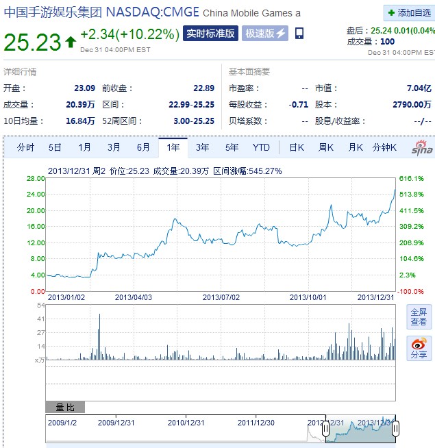 近日有媒体将过去的一年国内游戏业所诞生的数字做逐一的统计,这些数字的背后反映了国内游戏市场、尤其是今年的网页游戏、及爆发性增长的手机游戏所取得的一系列成绩。其中中国手游全年上涨497.9%,成为美股港股中涨幅最大的股票,其次是金山网络和多玩YY,而市值最高的国内股票为掌趣网络,总市值达202亿元。均反映了国内手游市场的发展速度。 2013年20家A股上市公司发起22次网游并购 耗资194.69亿元 今年以来, A股共有20家上市公司发起22次有关网游的并购,其中14次为手游收购,涉及并购金额194.69亿元。 2013年最大金额并购:百度19亿美元收购91无线 百度2013年7月16日对外证实将斥资19亿美元收购91无线。这也打破了2005年雅虎投资阿里巴巴时10亿美元的纪录,成为中国互联网行业最大的投资案。 美股及港股涨幅最高的游戏概念股:中国手游、金山网络、YY、360、腾讯 2013年12月31日股价与2013年1月1日对比,涨幅最大的5只游戏概念股(美股、港股)分别为,中国手游全年上涨497.9%、金山网络全年上涨309.3%、YY全年上涨247.1%、奇虎360全年上涨178.9%、腾讯控股全年上涨98.6% 美股及港股去年跌幅最大的游戏概念股:九城、人人网 2013年12月31日股价与2013年1月1日对比,港股及美股只有2只游戏概念股股价下跌,分别是九城全年跌27.6%、人人网股价全年跌10.6%