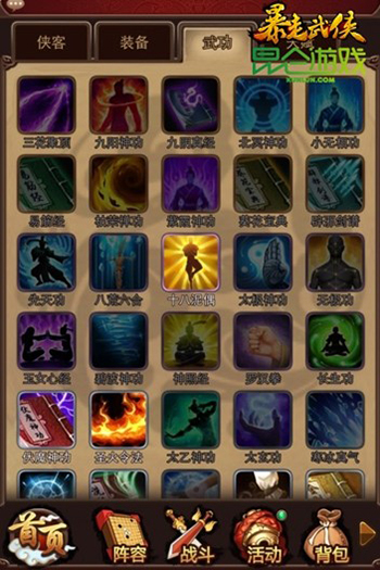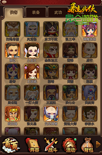 二、玩法篇 从画面篇可以看出,《暴走武侠》的卖相还是非常好的,但光有卖相也无法持久的吸引玩家,只有在玩法上有深度有内涵,才能在一眼情人过后,陪伴玩家长长久久,那么《暴走武侠》的内涵究竟够不够呢? 首先从武侠背景入手,《暴走武侠》的世界观立足于金庸十四部经典,其号称收录了几乎所有叫得上名字的江湖豪杰,虽然这一点无从证实,但小编从弟子库中随机抽取的弟子中居然后各种小说中的小喽啰(比如当年周星驰演的清兵喽啰形象),可见其人物丰富程度。 其次是武功和武器,《暴走武侠》的武功库里可见的武功就有超过200种,并且有攻击、防御、控制、辅助明确的武功分工,丰富的主动技能能带来富有深度的搭配方案,还有尚未开放的种类,武器就更别说了,据称研发商参考百晓生兵器谱原班重塑了整个兵器谱上的武器,反正小编听过没听过的都有。 |