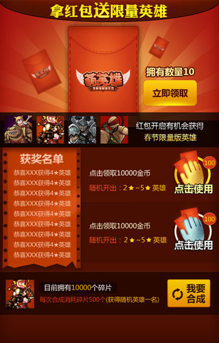 《萌英雄》点燃的新一轮卡牌热真是挡也挡不住!作为新年新生代卡牌手游巨作,如果你还没有玩过的话,真是太!落!伍!了! 没有赶上首测的小伙伴们,1月27日11:00《萌英雄》App Store新服“暴风平原”及安卓新服“乌提斯坦”热辣开放,只等你来!独特的英雄成长系统,丰富多样的休闲玩法,惊险刺激的副本探险,激萌精致的角色造型,《萌英雄》带你抢先体验卡牌手游新纪元!撸起来就完全停不了! App Store下载地址:https://itunes.apple.com/cn/app/meng-ying-xiong/id737189895?mt=8 安卓版下载地址:http://static.lolheroes.com/release/Meng_Soonart167.apk 新春礼不断 红包送不停 《萌英雄》节日限定英雄大放送 十亿红包免费拿! 春节期间,《萌英雄》为玩家们准备了十亿红包,海量奖品!只要登录游戏,新年红包免费送!大量金币、五星英雄……你想要的一切,统统都在红包里! 什么?红包不够?《萌英雄》当然不会这么小气!精英副本、地狱BOSS统统有掉落,钻石也能随时随地随心购买!只要参与游戏,《萌英雄》让你开红包开到手抽筋,更有机会获得新春特别限定版英雄! 《萌英雄》全民新春大狂欢即将开启!你也想人品爆发获得金色限量版英雄?记得春节休假也不要忘记登录《萌英雄》! 你来或者不来,红包就在这里,不增不减;你开或者不开,五星限定英雄就在那里,不来不去。出手晚了,好礼就全都被别人抢走了哦! 你冲级 我买单 新服活动多多,福利多多,钻石金币免费送,保证拿到你手软! 谁是冲级专家?谁是PK王者?到《萌英雄》里来决个高下!冲级还有大奖拿,钻石金币统统送。你来升级我买单,再没听过比这更爽的了! 新服开启首周,冲级大赛一触即发,来迟你就吃亏了! 每天登录有好礼 四星英雄免费送 《萌英雄》注册就送7日好礼。每天登录游戏,即可免费领取金币、奖杯,还送超多经验卡,从此升级不发愁! 对于累计登录7天的忠实玩家,还有碉炸天英雄——四星剑圣,能攻能守能加血,用过才知道有多爽! 了解更多活动详情请查看 《萌英雄》官网:www.lolheroes.com 新浪微博:http://weibo.com/lualuhero 腾讯微博:http://t.qq.com/lolheroes iOS版官方QQ群:344144757 安卓版官方QQ群:142433953 微信公众号:lolhero [编辑:F.L.S.D]