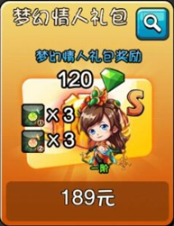 元宵&情人节特别礼包巨献: 9元礼包(超值奉献):1阶果实3个,2阶果实3个,120钻石。 18元礼包(浓浓心意):30个万能拼图,2枚爱情石。 132元礼包(爱意满满):300个万能拼图,20枚爱情石。 198元礼包(王者锦囊):2888钻石,4阶果实2个,5阶果实2个。 据悉此时限时礼包内的机智貂小婵必杀为狂鞭练舞,被刚入手的玩家成为史上最强破防S卡,金刚肉盾在美眉面前瞬间倾倒。一口盐汽水喷过去,谁能抵挡我们三国最萌妹纸。 189元礼包(梦幻情人):S品质机智貂小婵1枚,1阶果实3个,2阶果实3个,120钻石。 以上呢,就是这次特别企划更新的大致内容啦,嘿嘿,更多喜悦更多精彩,就请进入游戏亲自看看吧! [编辑:F.L.S.D]