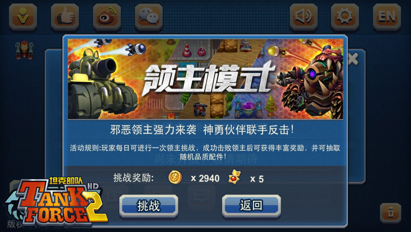 《坦克部队2》是一款坦克闯关题材的手机游戏,一经上线就受到闯关爱好者的追捧。游戏不仅有丰富趣味的众多关卡,更有强大的守关BOSS供玩家挑战。新年新气象,全新版本的《坦克部队2》已经上线,势必再掀起闯关新风暴! 《坦克部队2》iOS版下载地址:http://port.duoyi.com/rewrite/a.py?fromid=208801004 《坦克部队2》新手礼包领取:http://port.duoyi.com/rewrite/a.py?fromid=207901001 《坦克部队2》精美CG观看: 全新成就系统 看看谁是坦克之王 《坦克部队2》本次更新推出的新版本,重新调整了成就系统,将玩家的各种成就分为战斗、关卡、技能和坦克4大类,玩家可以在这里看到自己详细的成长历程。值得一提的是,各种成就也是五花八门,比如“让子弹飞”技能,需要玩家为坦克更换配件,将坦克提速到一定程度;再如“小小财迷”技能,需要玩家消灭50辆福利车。众多成就充分满足了玩家的挑战欲,谁才是真正的坦克之王,看看成就系统就知道啦! 全新领主模式 挑战者的终极目标 BOSS一定是闯关的终极挑战?当然不是。《坦克部队2》玩家的终极目标可不是守关BOSS,而是全新领主模式中的邪恶领主。领主们拥有比BOSS更强大的属性和技能,更有召唤小弟的独家绝技,玩家需要面临领主和众多小兵的多面包抄,哪怕一丁点的失误都会导致败局。在领主模式中完美获胜,成为挑战者们的终极目标,也是玩家们彼此炫耀的最好方式。 众多场景地形 坦克闯关趣味众多 《坦克部队2》一共有上百个关卡,分为八种各具特色的场景,有树丛茂密危机暗藏的丛林,也有遍地荒凉的沙漠,玩家甚至还能驾驭坦克在云层中作战。每个场景中都有各自的特色元素,比如在神秘的基地场景中,敌人的发电站会不时引发从天而降的闪电,无论是对敌人还是对玩家的坦克,被雷劈都不是一件很爽的事情。加油站、断桥、陷阱等等元素,给玩家的闯关之路增添无穷的乐趣。 敌军众多玩法多样 满足你的挑战欲 闯关类游戏迷追求的是不断挑战自己的成就感,《坦克部队2》能够满足任何玩家的挑战欲。游戏设计了众多不同类型的敌军,地上跑的天上飞的,还包括不能动但威力超强的炮台,这些敌人会随着关卡的深入,陆续出现在地图中,闯关后期每个关卡甚至能有近10种敌人。埋雷、自爆、偷袭,种种进攻方式层出不穷,让坦克爱好者们在紧张刺激的大战中大呼过瘾! 独具特色的场景,难度层层递进的关卡,还有强大的BOSS、强悍的邪恶领主,《坦克部队2》的全新版本为玩家准备了一条极具挑战的闯关之路。想要驾驭坦克,充分享受挑战成功的荣誉感吗?那就赶紧来试试! 《坦克部队2》iOS版下载地址:http://port.duoyi.com/rewrite/a.py?fromid=208801004 [编辑:F.L.S.D]
