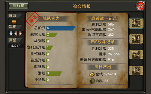 二战绝密档案曝光,轴心国与同盟国争夺大西洋控制权的详细情报数据惊世公开!《决战大洋》全面披露战争期间战役胜利次数、击沉舰艇数、从港口获得资源数量等诸多从未面世的绝密情报数据! 《决战大洋》作为国内首款“海战题材军事手游”,致力还原真实历史,重现大西洋海战的宏大和壮烈。战役次数、舰船数量、资源数量等作为衡量战争双方实力对比的重要数据,历来都被列为绝密。而在游戏中,“日志”这一独特功能,详细地记录了玩家在游戏中的各项数据。 玩家可以在“日志”中查看到综合情报、战役情报、PVP情报、经济情报等四大项数据。在各项情报中,舰队实力、战役胜利次数、击沉航空母舰、战列舰等9种战舰的详细数量、每日获得金钱、油料数量、在本阵营港口城市的声望等等所有游戏数据都一一详尽记录。 二战大西洋海战绝密档案的曝光,不止是便利玩家查阅战争数据,更加记录着玩家游戏的辉煌历程! 《决战大洋》官方网站:http://d.gfan.com [编辑:F.L.S.D]
