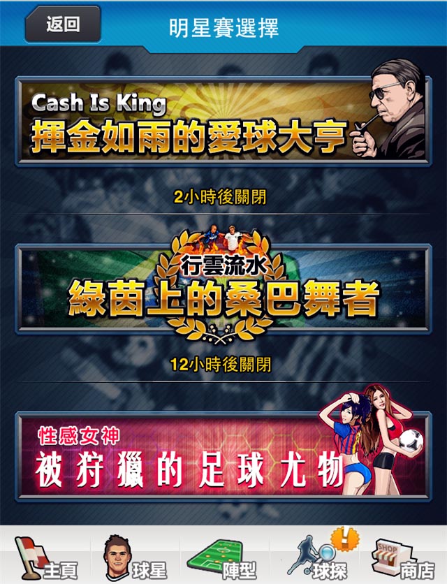 作为从越狱开测便一路被广大球迷、玩家追捧而来的《天天爱足球》,近日随着欧冠淘汰赛的开战在国内足球圈掀起了一股“天天爱足球”热!与其他足球题材手游相比,《天天爱足球》凭借着新颖的足球竞技玩法、丰富多样的卡牌系统、个性化的装备和球员养成、完善的各大赛事玩法,从众多同质化严重的手机游戏中脱颖而出。 今日,在游戏众多玩法中,小编将为各位玩家带来《天天爱足球》中明星赛的详细攻略和玩法,一起来体验明星赛场上的那些精彩内幕吧! 《天天爱足球》设置全球独创的明星赛环节,与巨星面对面过招!游戏中,玩家率自己的球队与指定巨星领衔的队伍进行比赛,比赛胜利后将有机会获得该巨星卡牌加入到自己的队伍中。每日会更换挑战的国家队,每周会更新领衔的巨星,如绿茵场上的桑巴舞者—巴西队,隆隆作响的日耳曼战车—德国队,还有被狩猎的足球尤物…… 现已开启以下明星赛: 行云流水,绿茵上的桑巴舞者——(巴西):天才为主,战术为辅,不尊崇集体的力量,而将胜负建立于个人才华的闪光。他们从不缺少天才,每个球员都拥有令人拍案叫绝的精彩盘带和不可思议的控球能力。 比赛内容: 蓝衣军团★:较大概率获得选秀卷,小概率获得3★德罗西,基地概率获得2★队长技能天赋卡; 蓝衣军团★★:较大概率获得选秀卷,小概率获得3★德罗西,基地概率获得2★队长技能天赋卡; 蓝衣军团★★★:较大概率获得选秀卷,小概率获得3★德罗西,基地概率获得3★队长技能天赋卡; 钢铁意志,隆隆作响的日耳曼战车——(德国):无论对手是谁,他们都意志坚定,刚毅如铁。持续90分钟不犯错的精准配合,体现这个民族严谨和铁血的作风。任何敢于挑战他们权威者,都会遭到毫不留情的打击。 固若金汤,逆袭的蓝衣军团——(意大利):堪称艺术的防守!所有致命传球和突破都在最后一刻被他们恰到好处地破坏,无论对手如何精准跑位穿插,周围都有他们亦步亦趋的身影。再凶猛的进攻也只能锋折锐断,望门兴叹。 球场雄吼,狩猎绿茵的三狮军团——(英格兰):强健高大的体格、极强的爆发力和速度!他们是现代足球的开山鼻祖,无数次的搏杀中,战法渐如独孤九剑般弃繁从简,简单直接却凶猛有效,从实用出发,以胜利终结。 赌上所有荣誉,与斗牛士的殊死之战——(西班牙):华丽优雅!桀骜不驯!他们追求的是带有调戏意味的一剑剑刺死对手,完全掌控比赛的节奏,等待他们眼中的那头公牛喘着粗气毫无还手之力时,再轻轻给予致命一击。 性感女神,被狩猎的球场尤物——(足球宝贝):球场冷艶的外表下,藏有透着诱惑的狂野眼神。傲人三围青春胴体,在绿草和黑白球间翻飞着汗水。她们的胜负不在球门间,要征服的,是全世界男人的目光! Cash is King,挥金如雨的爱球大亨——(球场大亨):富可敌国,多金球主,财富只是空虚的数字,足球却是充实他们心灵的无上妙品。在他们眼中,一切大牌球员,只是供自己厮杀绿茵棋盘的血肉将卒。 比赛内容: 多金球主★:掉落1-2★赞助商,出售可获得大量欧元; 多金球主★★:掉落2-3★赞助商,出售可获得大量欧元; 多金球主★★★:掉落3-4★赞助商,出售可获得大量欧元; 豪门盛宴,足球名宿此刻灵魂附体——(大师意识):豪门盛宴,众星闪耀,无数绿茵名宿在这一刻灵魂附体。出神入化的球技,万世不朽的传奇,在奔跑和怒射中汲取天赋之光,用汗水和胜利证明成长的辉煌! 这是一场豪门的盛宴,众星闪耀,豪情四起,有出神入化的球技,有万世不朽的传奇, 2014《天天爱足球》,邀你一起决战巴西世界杯! 官方交流群:308709653 游戏下载地址:http://tieba.baidu.com/p/2803523768 官方微博:天天爱足球ios http://weibo.com/tiantianaizuqiu 官方微信:天天爱足球ios [编辑:F.L.S.D]