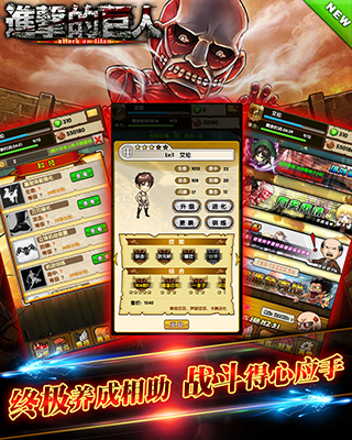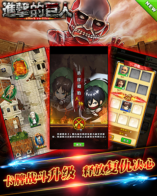 国内首款由同名动漫题材改编的卡牌手游《进击的巨人》觉醒内测2月27日正式开启,在全球上千万动漫迷的欢呼声中火爆上架!卡牌战斗完美进化,延续着艾伦的战斗欲望,唤起人类战斗的觉醒!今日这部堪称史上最惨烈的手游,将进行全方位解析,开启全人类的正面反击,和艾伦一起履行复仇的誓言! 《进击的巨人》官网:http://aot.zj-mobile.com/ 精英卡牌完美进化 在《进击的巨人》中,征召得力的战斗精英卡牌才是最重要的,有了精英助阵,你将所向无敌!游戏中的征召可以通过累计时间、声望和钻石三种途径,而征召的卡牌也分为普通、绿色、蓝色、紫色四个类别,并且按照种类顺序,其属性值也是逐级递增的!而卡牌也可以进行进化,完美进化后的卡牌,将会有超强的战斗属性,为你的战斗增添实力! 必胜阵型完善搭配 要想在战斗中全胜,卡牌不仅仅需要进化,更要有必胜的阵型!《进击的巨人》在游戏中根据原著人物关系进行了排兵布阵,制定了百余种阵型!根据阵型人数分配、兵种分配、属性及技能的分配不同,每个阵型都能够做到绝不相同的战斗效果!因此玩家需要根据自身的需求进行积累卡牌,并最终选择适合自己战斗完善阵型! 多重战斗不同体验 《进击的巨人》拥有多重战斗模式,不同模式下的战斗都将是一种全新的体验!剧情战斗、挑战战斗、竞技场、境外调查、资源争夺等,每一种战斗下都有惊喜的战利品,同时又为自身战斗累计经验,还有不同等级的卡牌随机掉落!卡牌不止可以出战为战争出力,更可以吞食来提升自身的等级! 完美营造飞行作战 《进击的巨人》游戏中别具匠心的还原了动漫中的飞行作战,运用最新的动态滚屏技术使战斗场景不断变化,完美营造出原著动漫立体集中装置飞行作战的感觉!更有精彩丰富的终极养成,不仅提升作战水平,其独具的卡牌隐性个性值也随之变化!全服玩家将在游戏中进行死亡挑战、天梯排行,在一次又一次的呐喊声中守护全人类的尊严! 《进击的巨人》觉醒内测正式开启,2014人类再起! 《进击的巨人》官网:http://aot.zj-mobile.com/ 新浪微博:@进击的巨人手游 [编辑:F.L.S.D]