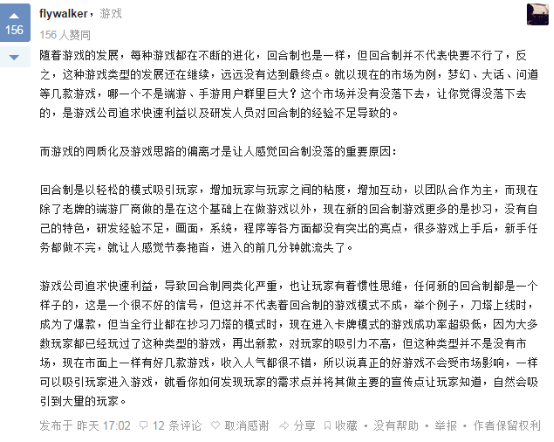 在问答网站知乎上,两方人马为了回合制的传统与创新各陈己见。原《问道》制作人小一认为,目前回合制RPG面临的最大问题就是产品同质化。游戏公司追求利益的本能导致回合制游戏不思进取。但回合制RPG市场依然庞大,只要能够继续创新,还有增长的空间。小一负责的《道王》就在向着这个方向走下去。