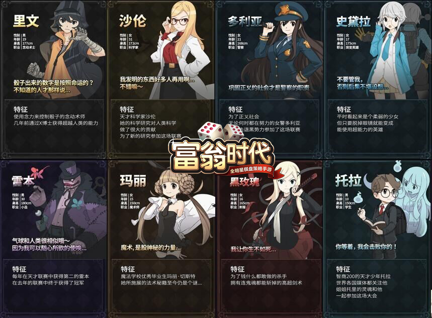 《富翁时代》的整体画面风格采用了唯美的二次元日漫风,剧情围绕着邪恶艾克斯博士举办“天才联赛”邀请世界各地能力者展开。目前已经开放了15名拥有自己背景和独特个性的可控角色。他们除了在游戏里有不同的属性侧重点和能力侧重点外,拥有自己的背景故事,性格爱好,甚至独立的语言和动作。丰富的剧情和角色让《富翁时代》完全可以成为一部独立的漫画进行阅读。同时,《富翁时代》手游与国内著名动漫发行“高能漫画”联手打造的同名漫画即将登录各大漫画平台,大家可以从漫画的角度感受整个故事的热血与战斗!